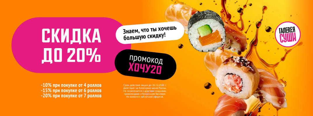Хоти и получи большую скидку на свой идеальный сет до 25.12.2026г. Предложение действует только на Категорию меню «Роллы». Не пересекается с другими скидками, промокодами и бонусными баллами. Не действует на блюда по акции. Не является публичной офертой.